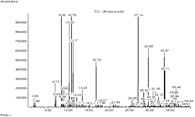 Хроматограмма эфирного масла одной из разновидностей дикой душицы.