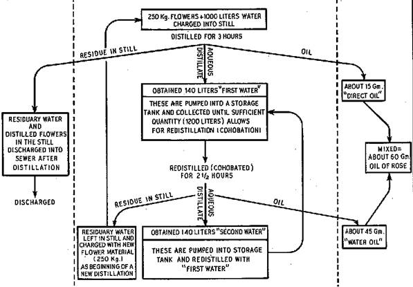 Болгарская схема получения дистиллированного эфирного масла розы.